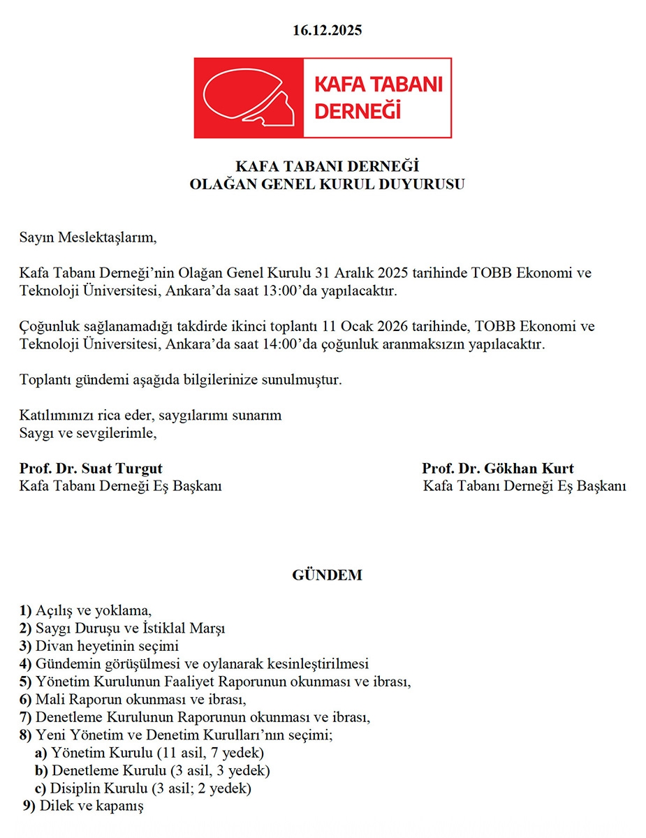 - 18.12.2025Kafa Tabanı Derneği Olağan Genel Kurul Duyurusu (31 Aralık 2025)